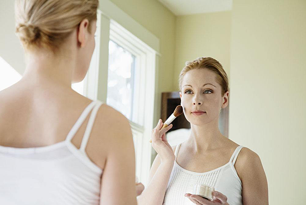 大多數化妝教學都會教你用碎粉定妝。如果你想讓化妝品變得更薄更自然,當你想定妝的時候,你可以局部定妝。局部化妝指的是只在容易產生油脂的地方,如頭部、鼻尖、下巴等,取少量碎粉輕輕掃一掃。這可以增加妝容更持久,同時保持整體水分,使妝容更加透明和自然。